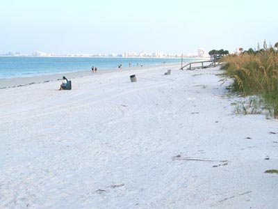 Pass-A-Grille beach just north of the jetty, before Hurricane Jeanne passed. Notice that you can't see the dune walkovers because they are surrounded by sea oat covered dunes. The sticks and yellow tape in front of the dunes are markers for sea turtle nests. |
