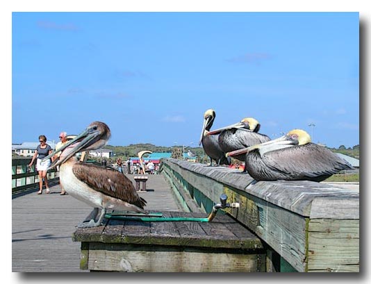 ![]() Above: one juvenile and 3 adult pelicans taking it easy on the pier.