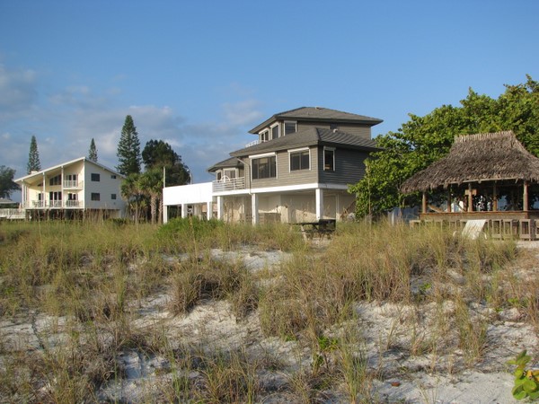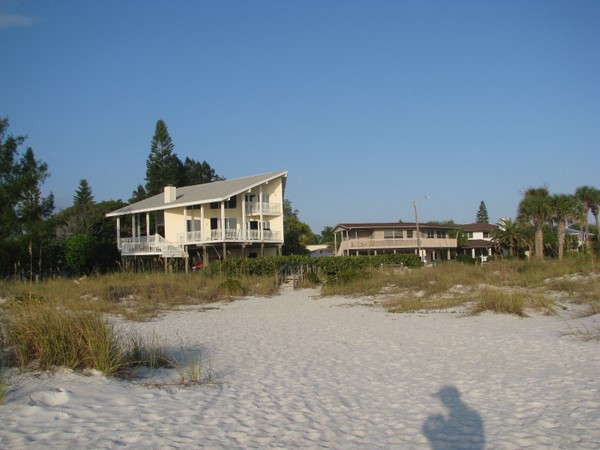 Beach houses at the end of 49th Street in Holmes Beach. There are a number of multi-story modern beach houses on the beach here, mixed in with the "Old Florida" style homes.