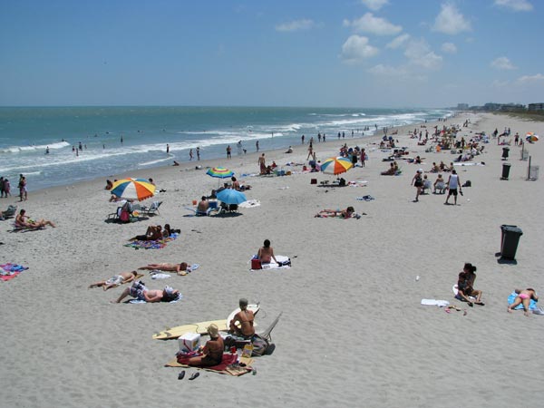 Above: Standing on the pier looking north. Not a lot of people on the beach north of the pier. In the distance is Port Canaveral and Cape Canaveral. |