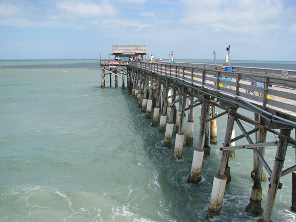 Above: The pier seems a bit ramshackled and cobbled together, but its holding up just fine. See that little tiki hut at the end of the pier. If you want to sip an adult beverage, but don't want the chatter and plate-banging of the regular bars and restaurants on the pier, go for the tiki hut. But hold onto your hat, it can get breezy out there. |