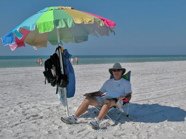 Hi fellow beach lovers! I'd like to share with you some of my favorite books related to Florida beaches. Most of the books I'm recommending below have long been a cherished part of my library and I refer to them almost daily. I highly recommend any and all of these books. You will not find any books on this page that I have not PERSONALLY read. You will not be disappointed with ANY book on this page. These books are your ticket to becoming a professional beach bum, like me! Yes, that's me (left) sitting under my umbrella at Fort Desoto Beach in St. Petersburg. |
