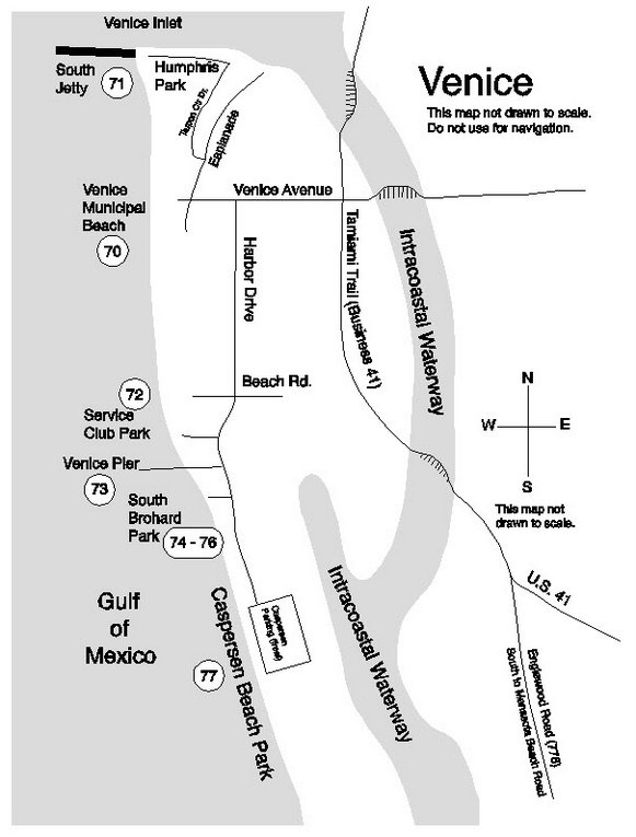 Directions: Venice is located 15 minutes south of Sarasota and Nokomis on US 41. From I-75, take the Jacaranda exit #193 and follow Jacaranda Blvd. to Venice Avenue. Venice Avenue will take you right through downtown Venice and straight to Venice Municipal Beach.