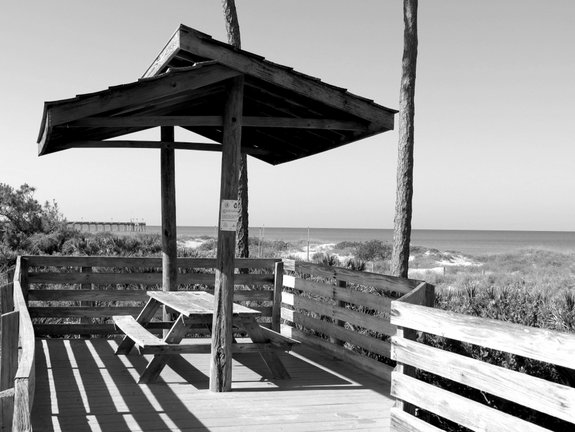 The park has no food concession and no lifeguard. The parking area is paved, but is not very large. The area between the parking lot and the beach is very thickly wooded with saw palmettos and pine trees. A 350-foot long boardwalk leads from the parking area to the beach through an area thickly wooded with saw palmetto and pine trees. Also situated on the boardwalk are several covered picnic tables.
