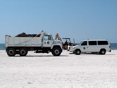 | Above: Treasure Island. Notice the foreground beach has been scraped clean by a front-end loader. | Above: Treasure Island. After scraping up the seaweed from the beach, it is put in trucks and carted off to be used as fill somewhere (I hope not at a landfill). Sometimes it is buried on the beach. |