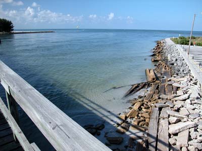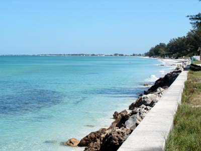 | John's Pass, Madeira Beach. A rock jetty on each side of the pass works to stabilize the pass. They seem to work fairly well. | Above: a seawall with rocks on Gasparilla Island. Notice there is no beach in front of the seawall, but further up the beach, where there is no seawall, there is a beach. |