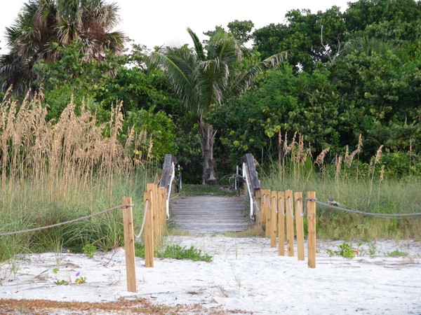 A typical Sanibel Island trail to the beach through the sea grapes, coconut palms and sea oats.